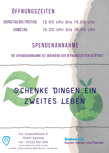 Wir begrüßen Sie im Leo-Fünf Diakonieladen und wir freuen uns auf Ihren Besuch. Unsere Öffnungszeiten sowie die Zeiten der Spendenannahme finden Sie auf unserem Flyer.